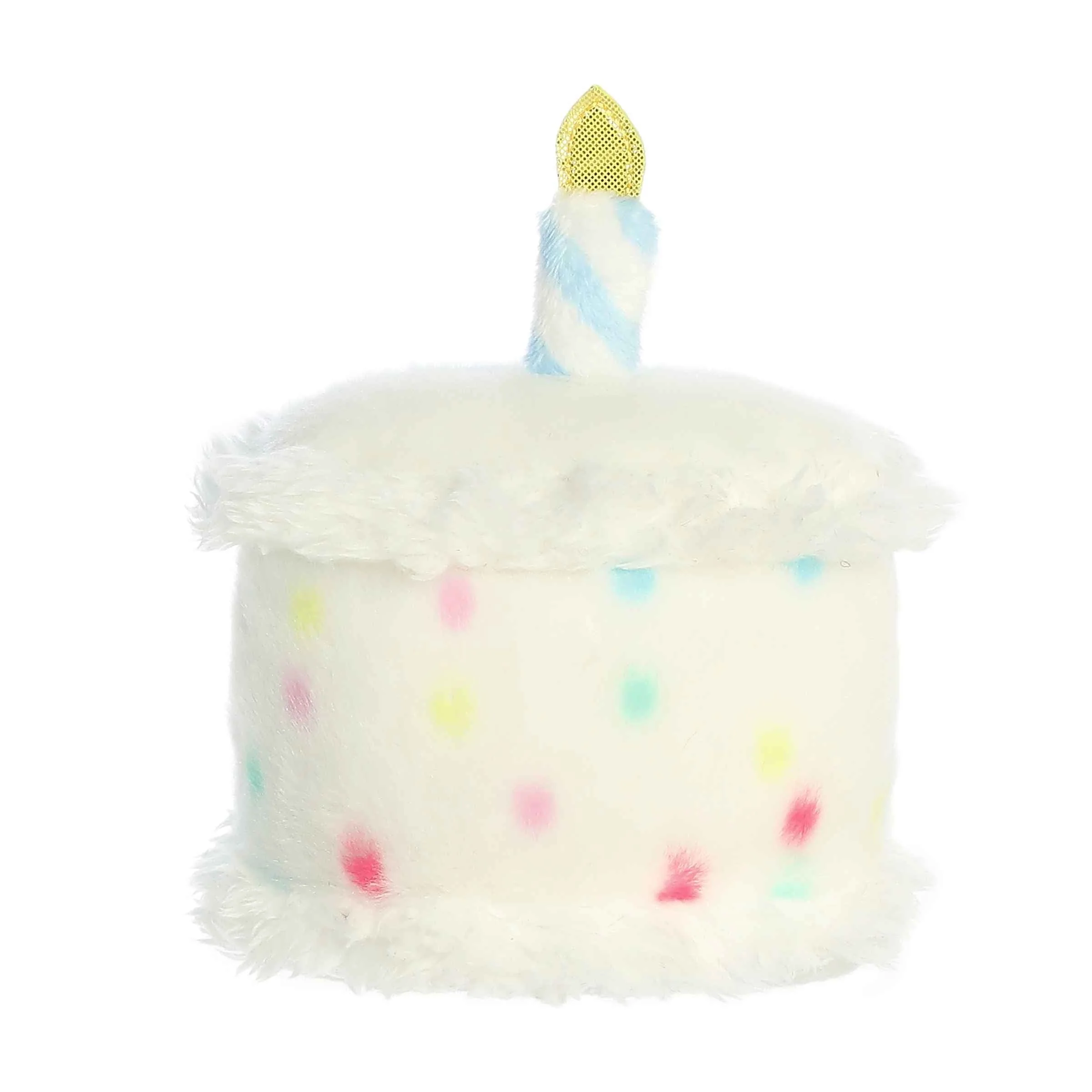 Happy B'Day Cake is a plush toy that resembles a piece of birthday cake. It's predominantly white with colorful sprinkles, a smiling face, and rosy cheeks. A candle on top, with a golden flame, adds a festive touch to its design, making it perfect for celebrating birthdays.